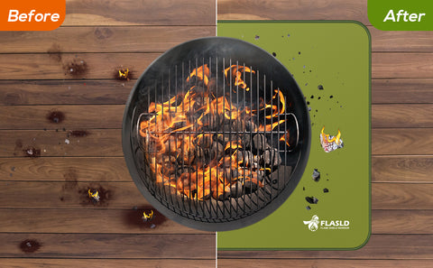🔥【High Temperature Resistant】- FLASLD under grill mat is made of fiberglass with silicone coating on both sides, it can withstand high temperature of 1800°F on both sides, it can resist sparks, charcoal, ash, flames to protect your deck and patio from high temperature damage, Compared to traditional mats, FLASLD grill mats will not melt, curl or crack due to heat.