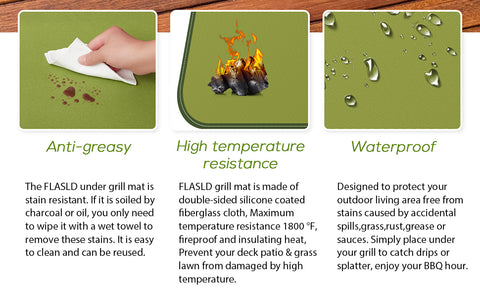 Fireproof: FLASLD grill mat is made of fiberglass with a silicone coating on both sides that can withstand high temperatures of 1800°F, which resists damage to decks and patios from all kinds of high temperatures.
