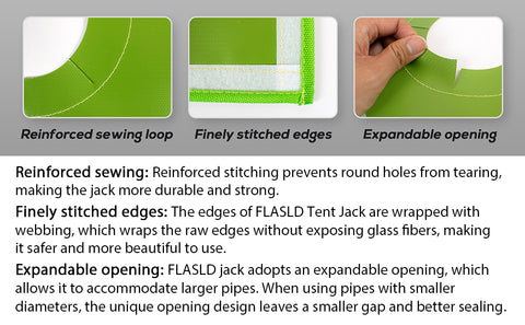 The temperature of the combustion inside the camping stove is usually over 1000°F, and the temperature of the exhaust pipe of the stove is usually over 550°F, and the ordinary tent fabric cannot withstand such a high temperature at all, and the tent fabric will be damaged by the high temperature and even cause a fire. FLASLD stove jack has a maximum temperature resistance of 1000°F, and the stove exhaust pipe will not cause damage to it.