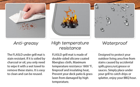 After Use: Grill mat & Fire pit Mat is easy to clean, you could easily remove oil, grease, mud and other stains from the fire retardant mat by water and towel, The grill mat can withstand high temperatures of 1800°F, which resists damage to decks and patios from all kinds of high temperatures.